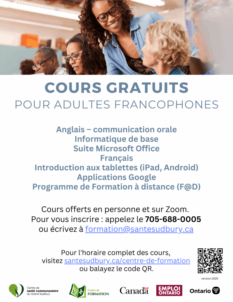 Des questions? Contactez notre équipe du Centre de formation à formation@santesudbury.ca ou au 705-688-0005.