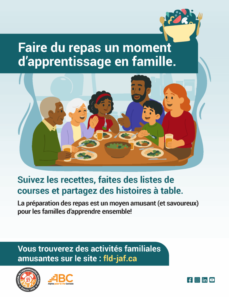 À l’occasion de la Journée de l’alphabétisation familiale le 27 janvier 2026, célébrée sous le thème « Faire du repas un moment d’apprentissage en famille », nous vous invitons à participer à notre Concours de cuisson en famille!