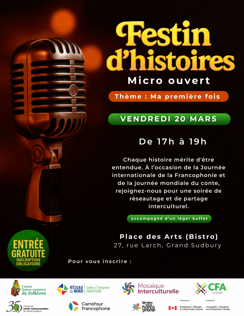 À l’occasion de la Journée internationale de la Francophonie et de la Journée mondiale du conte, venez vivre un moment unique de partage, de rencontres et de réseautage à Sudbury !