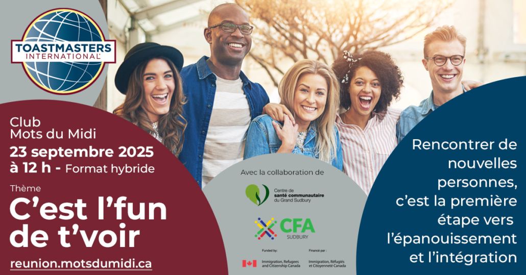 Participez à cet événement gratuit et hybride (en ligne à http://reunion.motsdumidi.ca/ ou en personne au 19, chemin Frood), le 23 septembre de 12h à 13h, organisé par le Club Toastmasters Mots du Midi de Sudbury en partenariat avec le Centre de santé communautaire du Grand Sudbury et le projet Communauté francophone accueillante (CFA Sudbury).